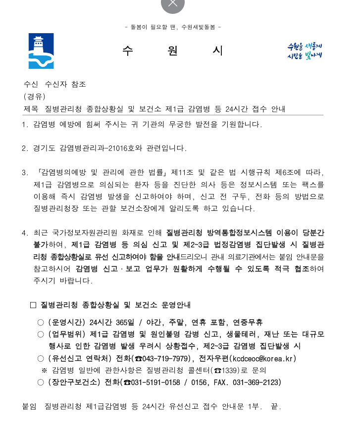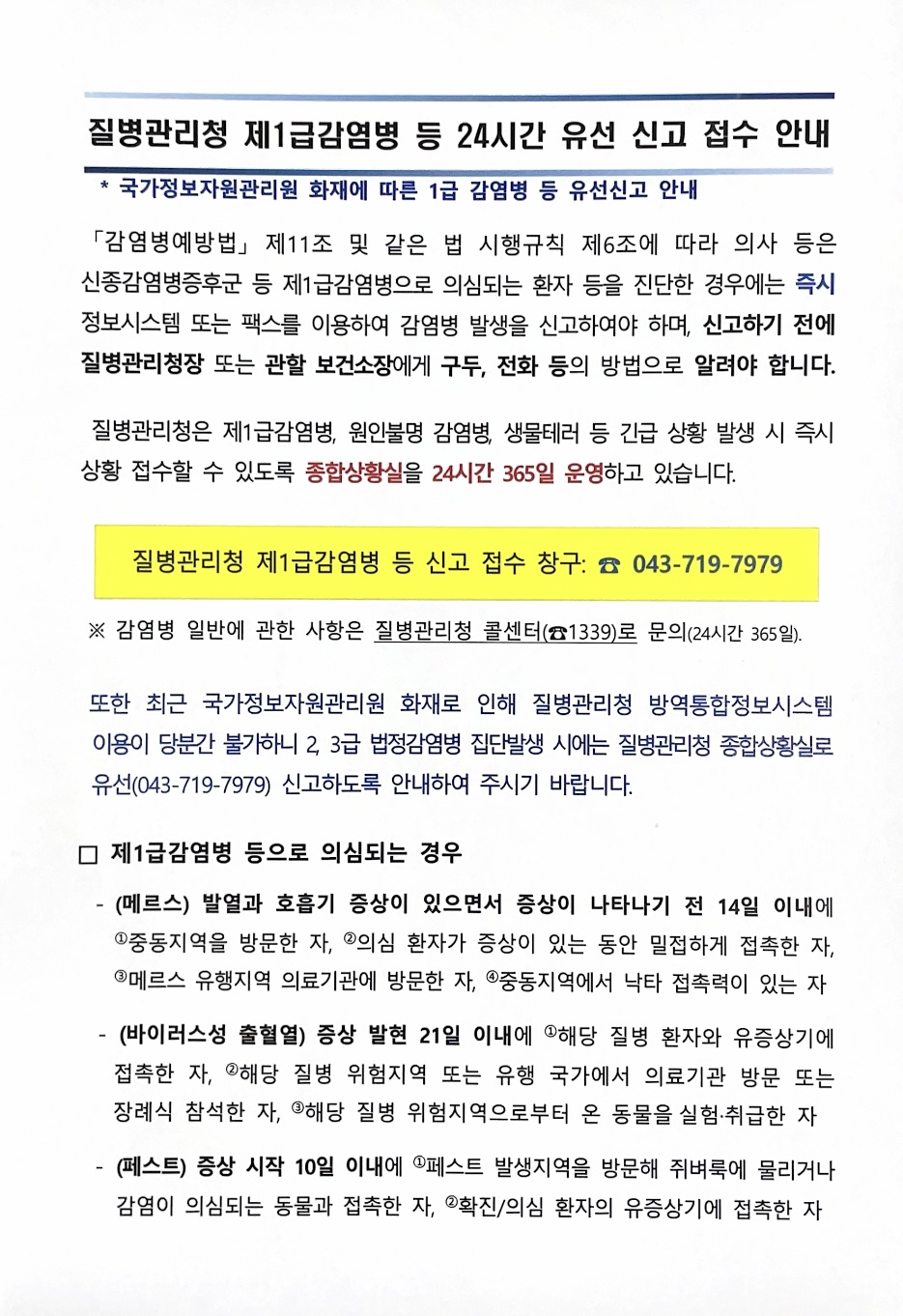 질병관리청 제1급 감염병 등 24시간 유선 신고 접수에 대한 안내드립니다