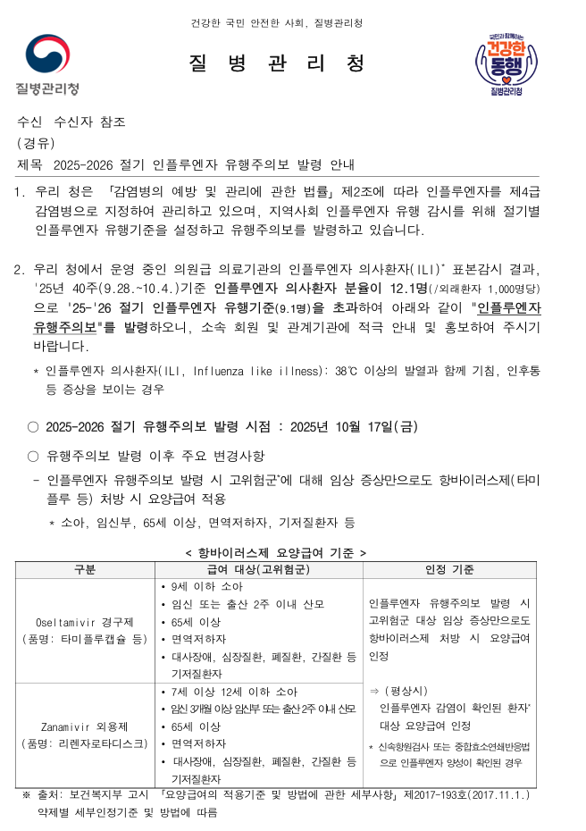 상기 호와 관련하여, 질병관리청에서는 의원급 의료기관의 인플루엔자 의사환자(ILI) 표본감시 결과, '25년 40주(9.28~10.4) 인플루엔자 의사환자 분율이 12.1명(외래환자 1,000명 당)으로 2025~2026절기 인플루엔자 유행기준(9.1명)을 초과함에 따라, 2025년 10월 17일(금)에 인플루엔자 유행주의보를 발령함을 안내합니다.