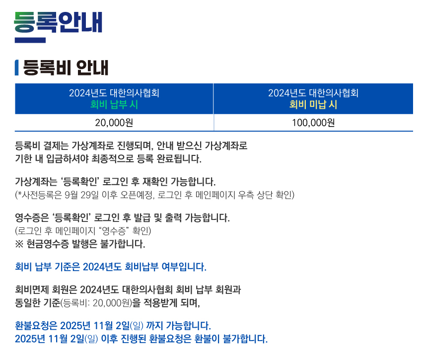 ▶사전등록 기간 중에 회비 납부하신 회원님들께서는 소속 의사회 혹은 시군구의사회에 회비 납부 후 가승인 요청을 꼭 하여 주시기 바랍니다(면제 포함). 가승인 요청 후 승인까지 1~2일의 시간이 소요될 수 있음을 유념하여 주시기 바랍니다.