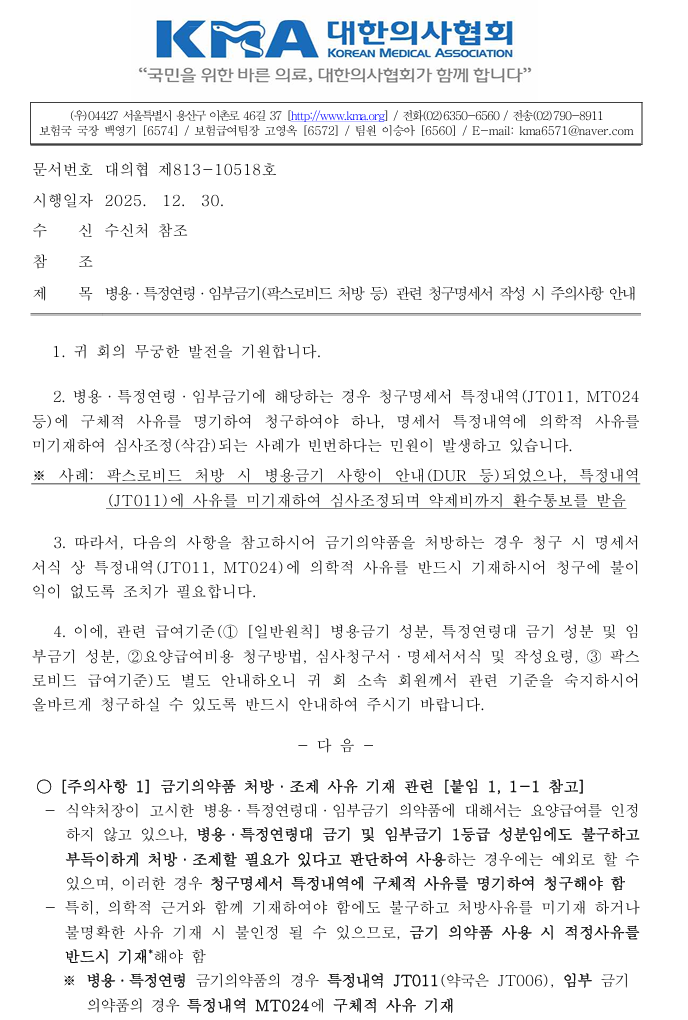 병용·특정연령·임부금기에 해당하는 경우 청구명세서 특정내역(JT011, MT024 등)에 구체적 사유를 명기하여 청구하여야 하나, 명세서 특정내역에 의학적 사유를 미기재하여 심사조정(삭감)되는 사례가 빈번하다는 민원이 발생하고 있다고 합니다.