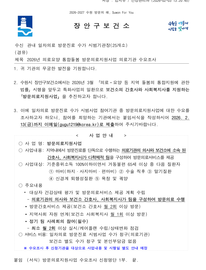 [장안구보건소]2026년 의료요양 통합돌봄 방문의료지원사업 의료기관 수요조사