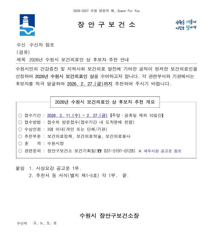 ○ 접수기간 : 2026. 2. 11.(수) ~ 2. 27.(금)【공휴일 및 주말제외 10일간】 ○ 접수방법 : 접수처 방문접수(접수기간 내 도착분에 한함) 혹은 등기우편 접수 ○ 수상인원 : 3명 이내(개인 또는 단체/기관) ○ 추천부문 : 보건의료정책, 보건의료학술, 보건의료봉사 ○ 훈 격 : 수원시장 ○ 관련문의 : 장안구보건소 보건기획팀(☎ 031-5191-0128) ※ 세부사항 공고문 참조 | ||