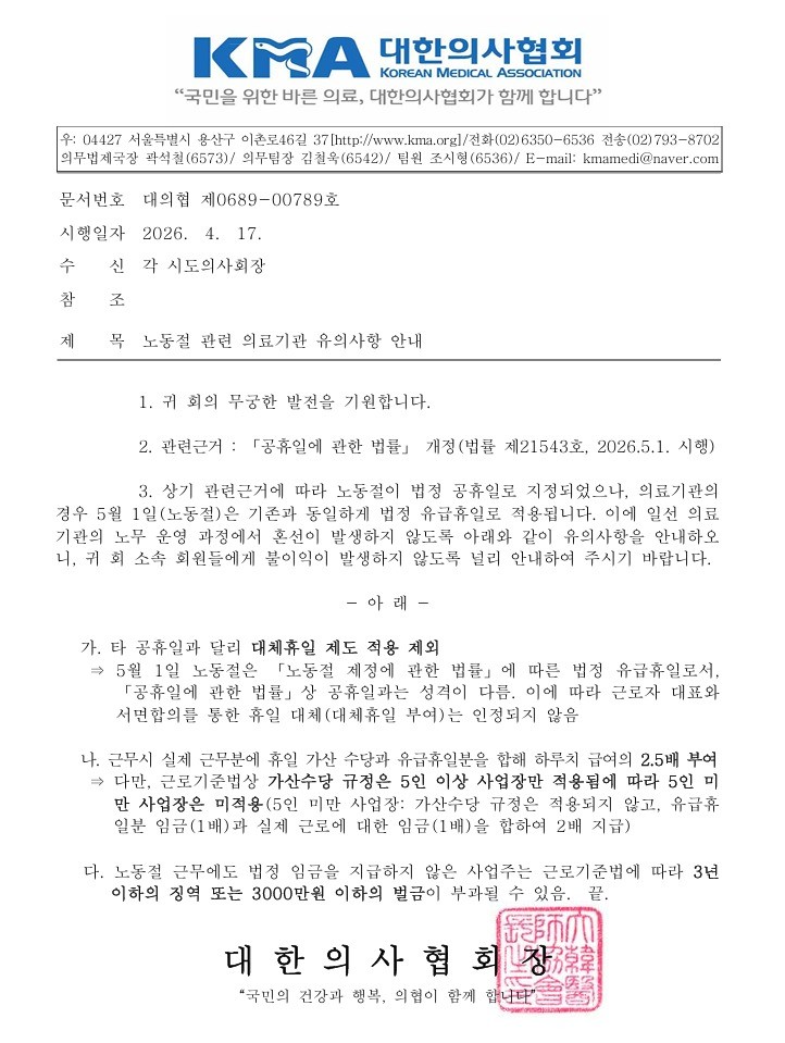 [의협]노동절 관련 의료기관 유의사항 안내