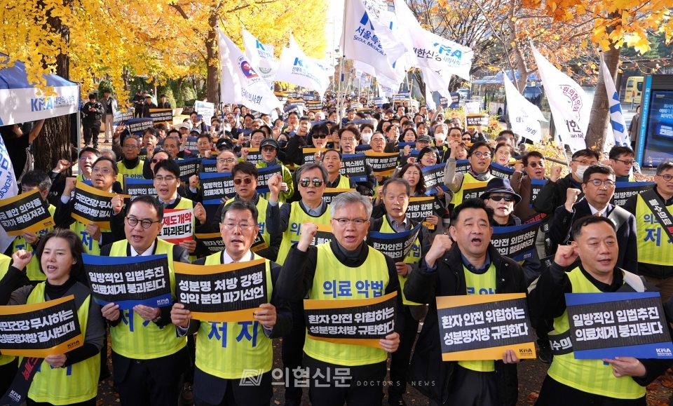 "성분명처방 강제 시도는 의료의 근간을 뒤흔드는 무책임한 도발"의협 범대위는 지난해 11월 16일 성분명 처방 도입 중단을 촉구하면서 국회의사당 앞에서 국민건강수호 및 의료악법저지를 위한 '전국의사 대표자 궐기대회'를 열었다.ⓒ의협신문