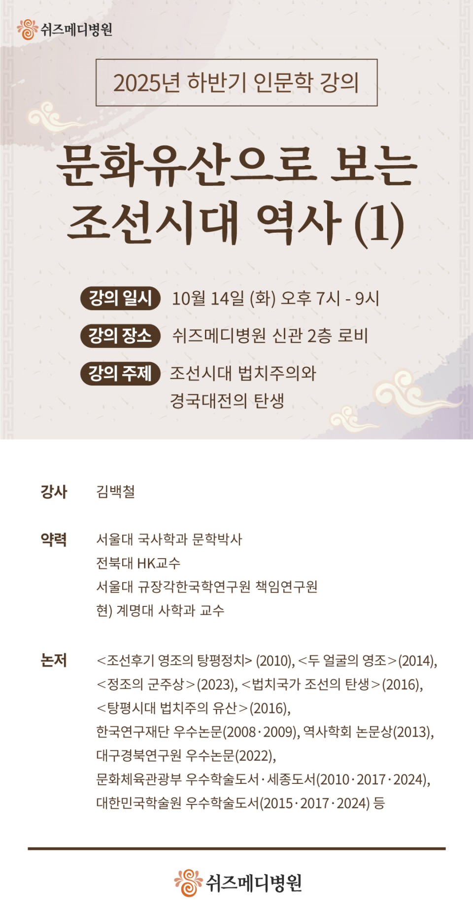 쉬즈메디 인문학강의(10/14) 페이지 정보 작성자 수원시의사회 작성일25-10-13 09:44 조회10회 댓글0건 짧은 주소 짧은주소 : https://www.suwonma.com/b/hs0208/1875 주소복사 목록 본문 2025 하반기 인문학강의 문화유산으로 보는 조선시대 역사(1) 일시: 2025년 10월14일( 화) 오후7~오후9시장소: 쉬즈메디병원 신관2층 로비 댓글목록 등록된 댓글이 없습니다. 목록