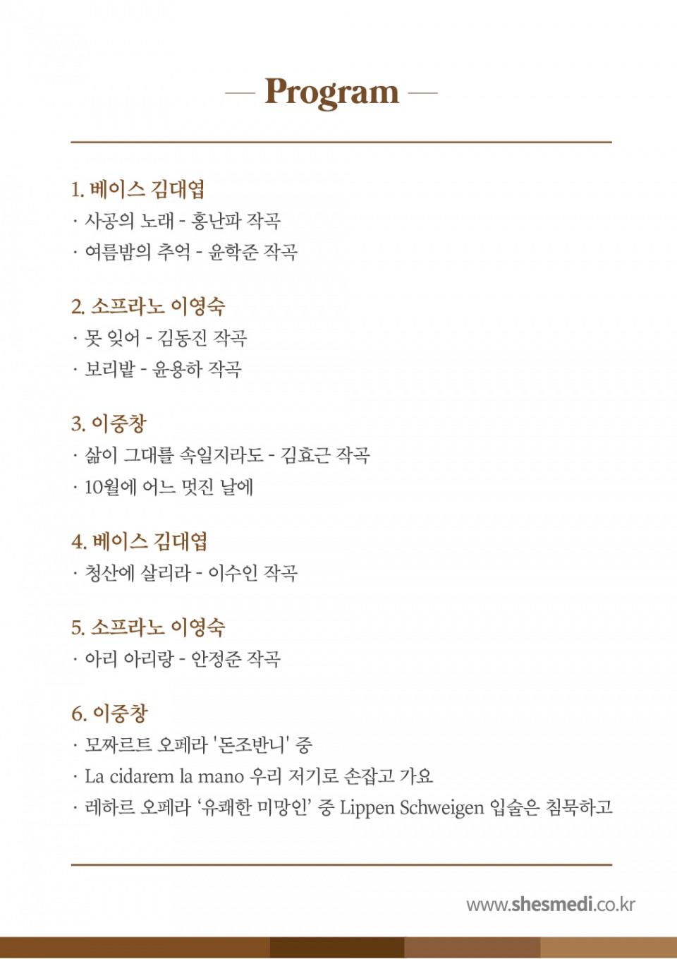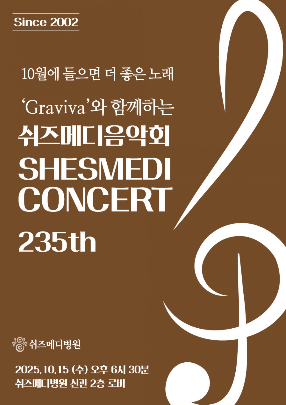 쉬즈메디 음악회 (10/15) 페이지 정보 작성자 수원시의사회 작성일25-10-13 09:48 조회10회 댓글0건 짧은 주소 짧은주소 : https://www.suwonma.com/b/hs0208/1876 주소복사 목록 본문 쉬즈메디 음악회 10월에 들으면 더 좋은 노래 일시: 2025년10월15일(수) 오후 6시30분장소: 쉬즈메디병원 신관2층 로비 댓글목록 등록된 댓글이 없습니다. 목록