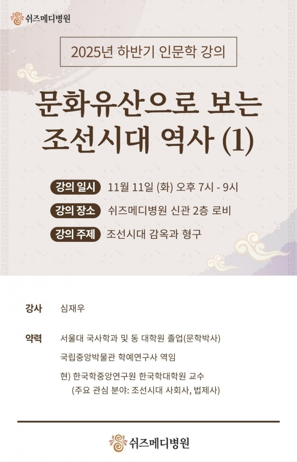 쉬즈메디 인문학 강의(11/11) 페이지 정보 작성자 수원시의사회 작성일25-11-11 09:25 조회43회 댓글0건 짧은 주소 짧은주소 : https://www.suwonma.com/b/hs0208/1879 주소복사 목록 본문 쉬즈메디 인문학강의일시:2025년11월11일(화) 19:00~장소: 쉬즈메디병원 신관2층로비 댓글목록 등록된 댓글이 없습니다. 목록